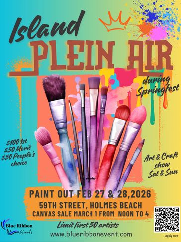 Part of the NEW Holmes Beach Spring Fest. Paint along the 58-60 Streets off Marina Drive, Holmes Beach. $29 entry fee, $100 business sponsor on other locations throughout island.